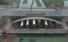 防城港国门大道项目黄竹江大桥首条拱肋实现合龙